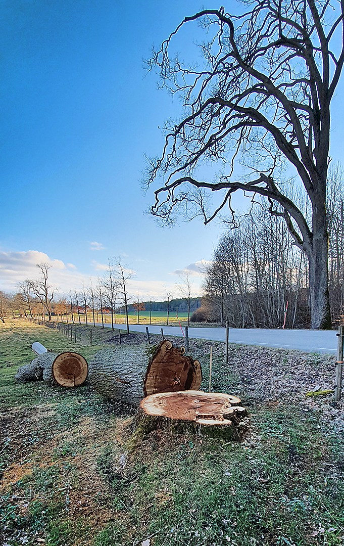 Fräsning av Ek-stubbe, 2 meter bred vid rötterna och extra hög. Villa i Mantorp