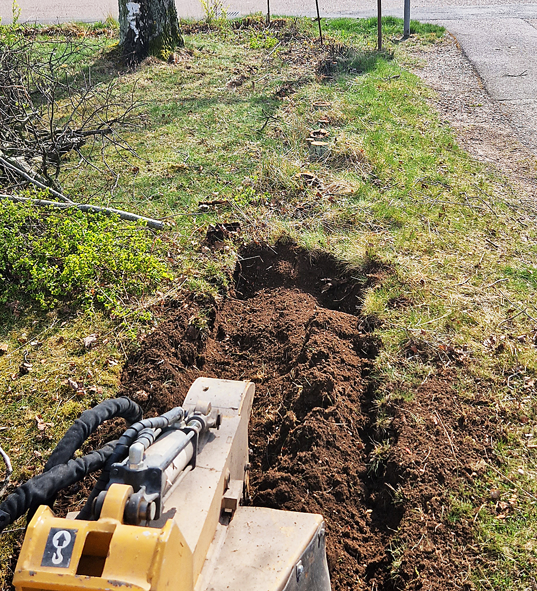 Vi fräser ner stubben istället för att gräva upp den, vilket gör att marken snabbt kan återställas.