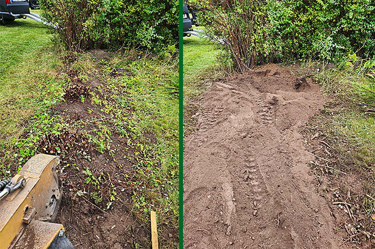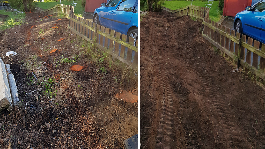 Arbetet anpassas efter din tomt och terräng, och i de flesta fall kan vi lämna ytan redo för ny jord eller gräsmatta direkt.