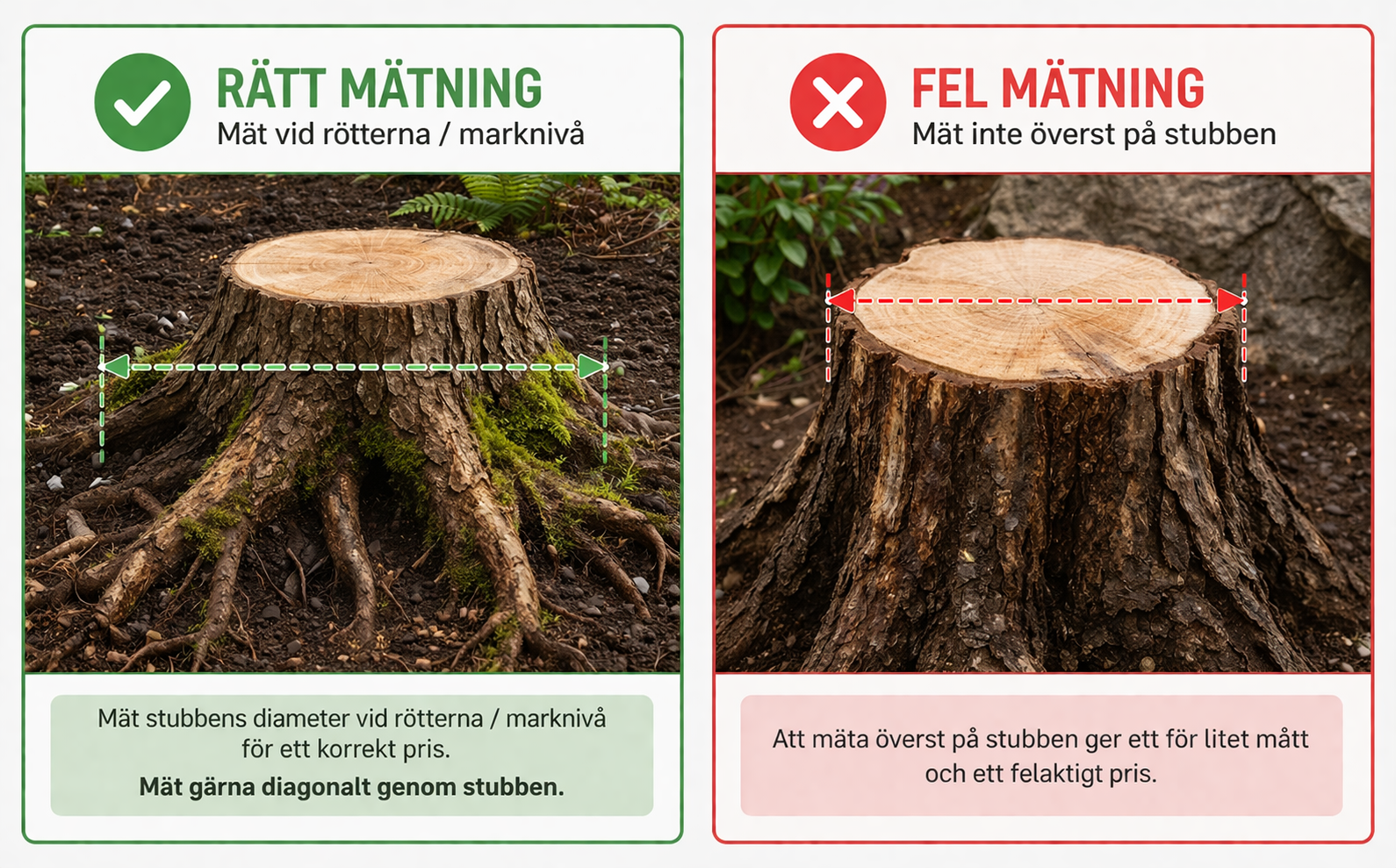 Ange stubbens diameter i cm, mätt vid rötterna / marknivå – inte överst på stubben.